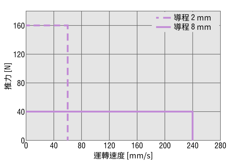 運轉速度-推力特性根據所搭配的馬達而不同。根據負載條件計算容許推力。