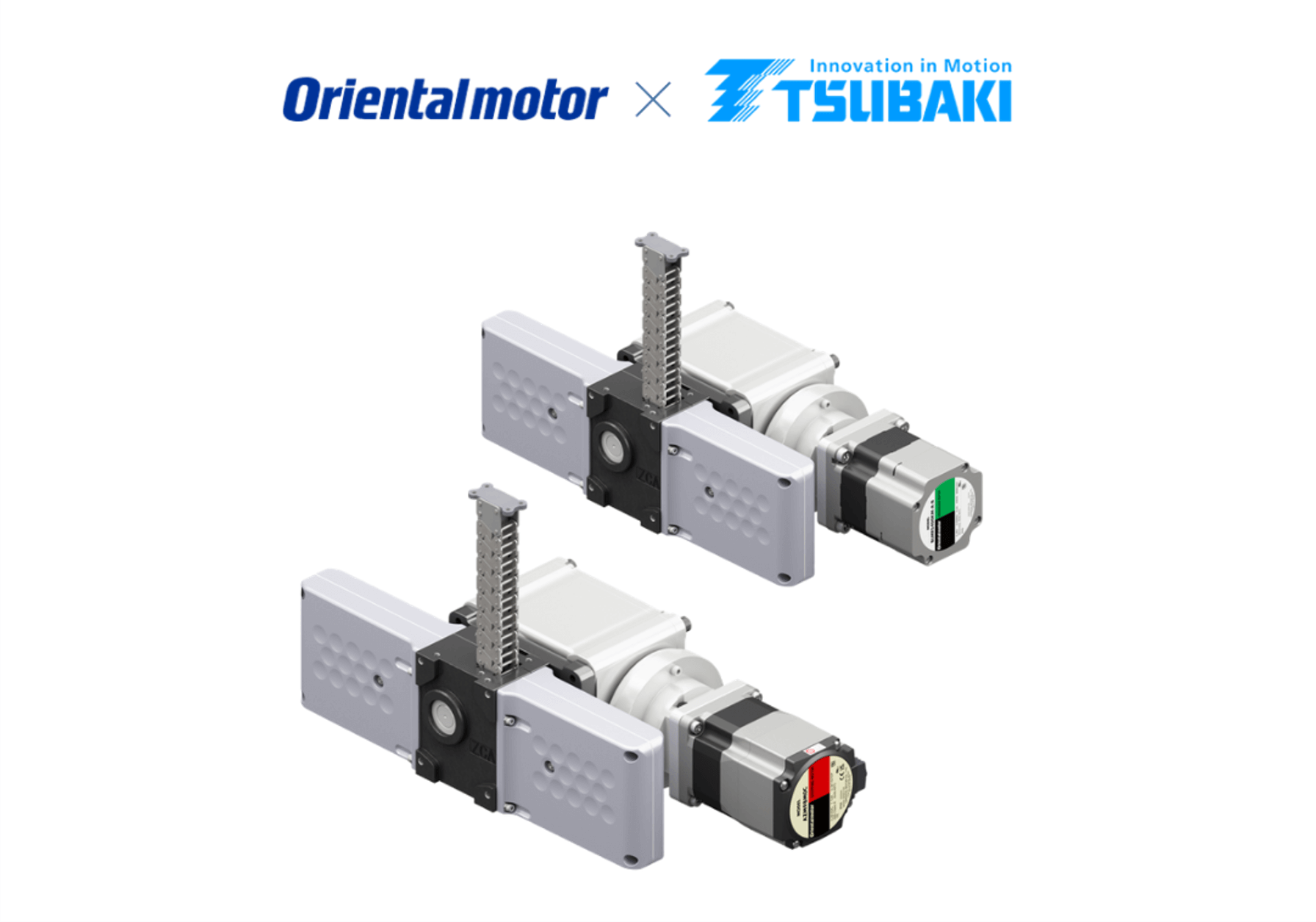 此為椿本鏈條製咬合鏈條傳動裝置與東方馬達製馬達組合的產品。咬合鏈條可收納在小巧的外殼內,相較於舊有的直線動作機構,實現絕佳的省空間效果。